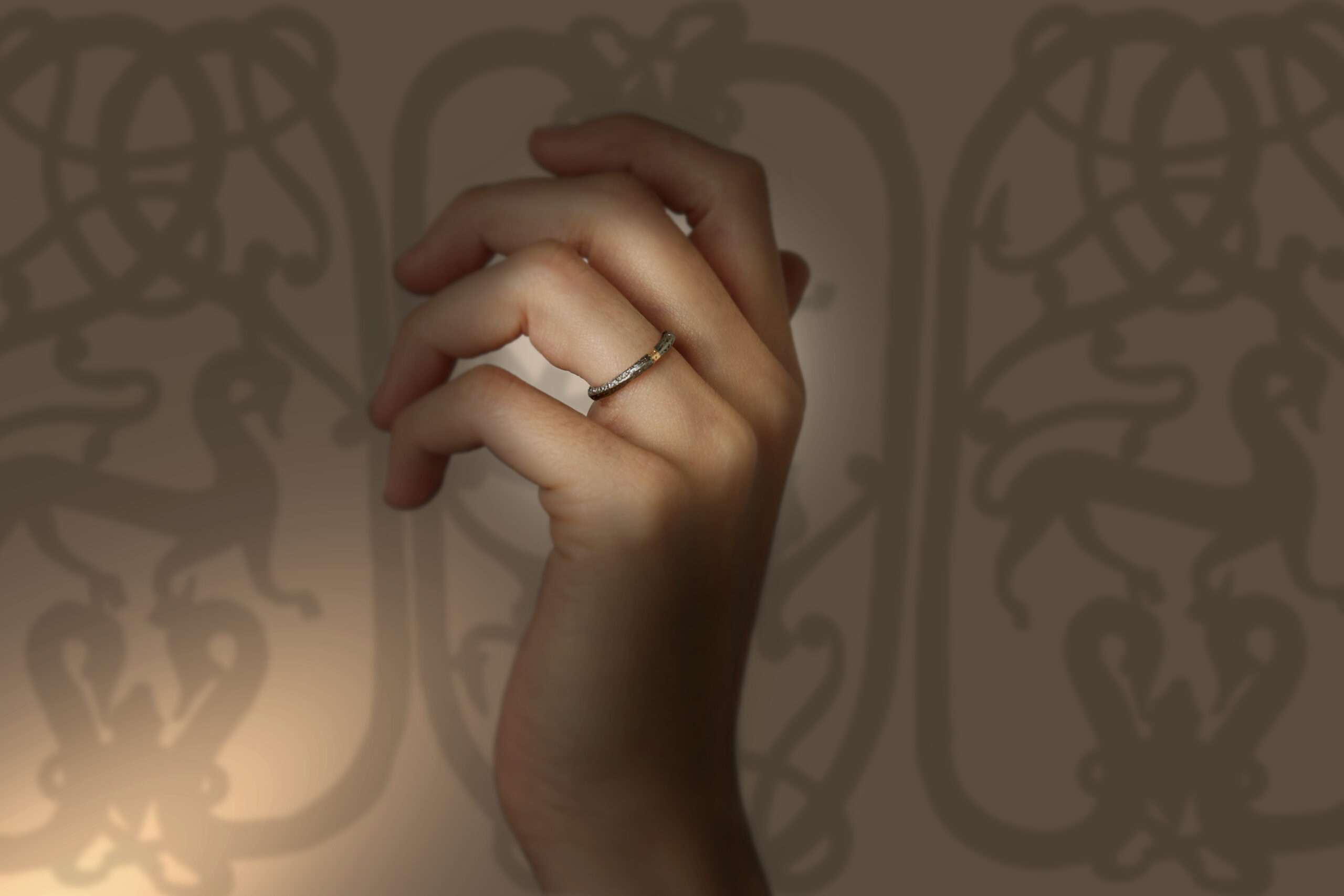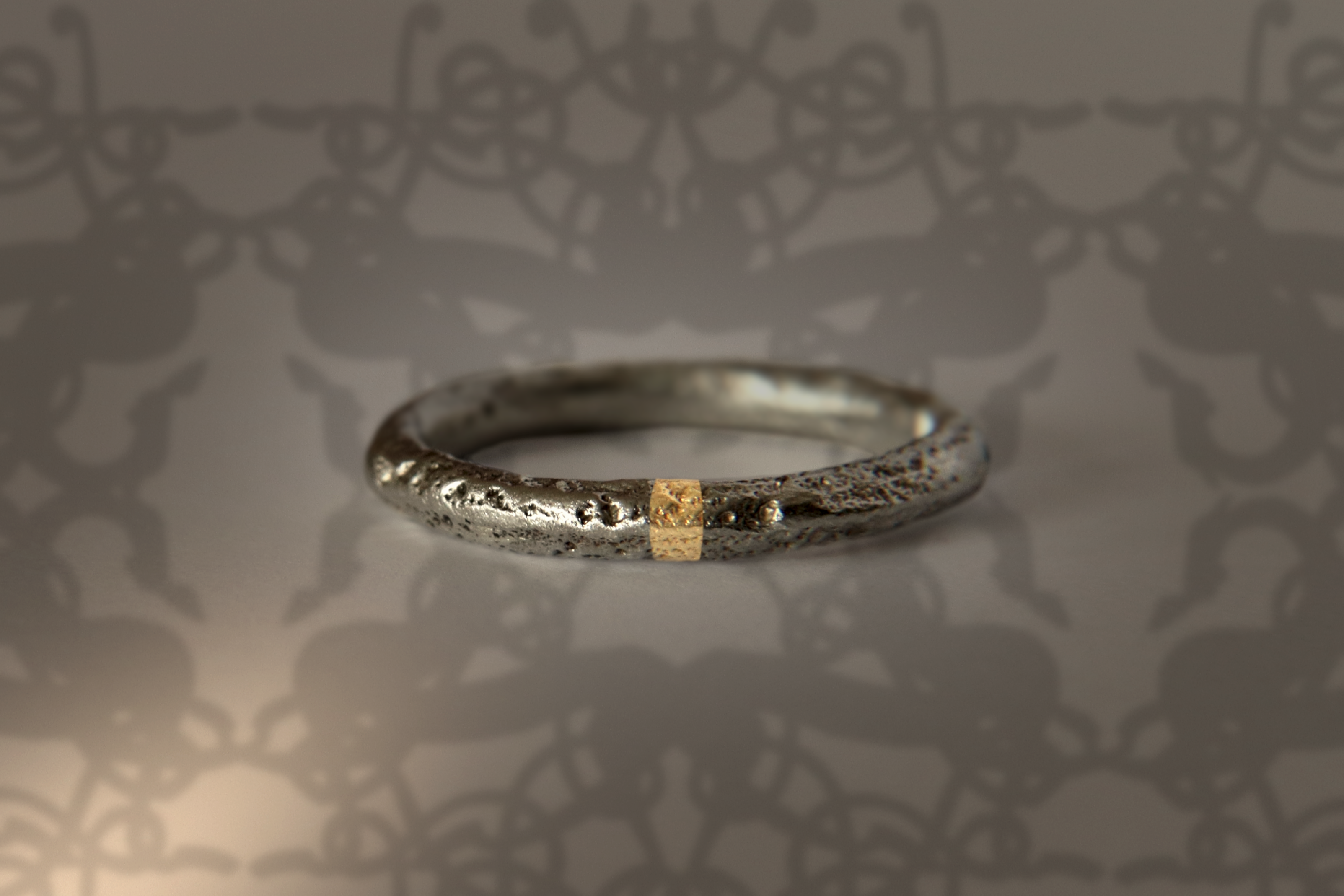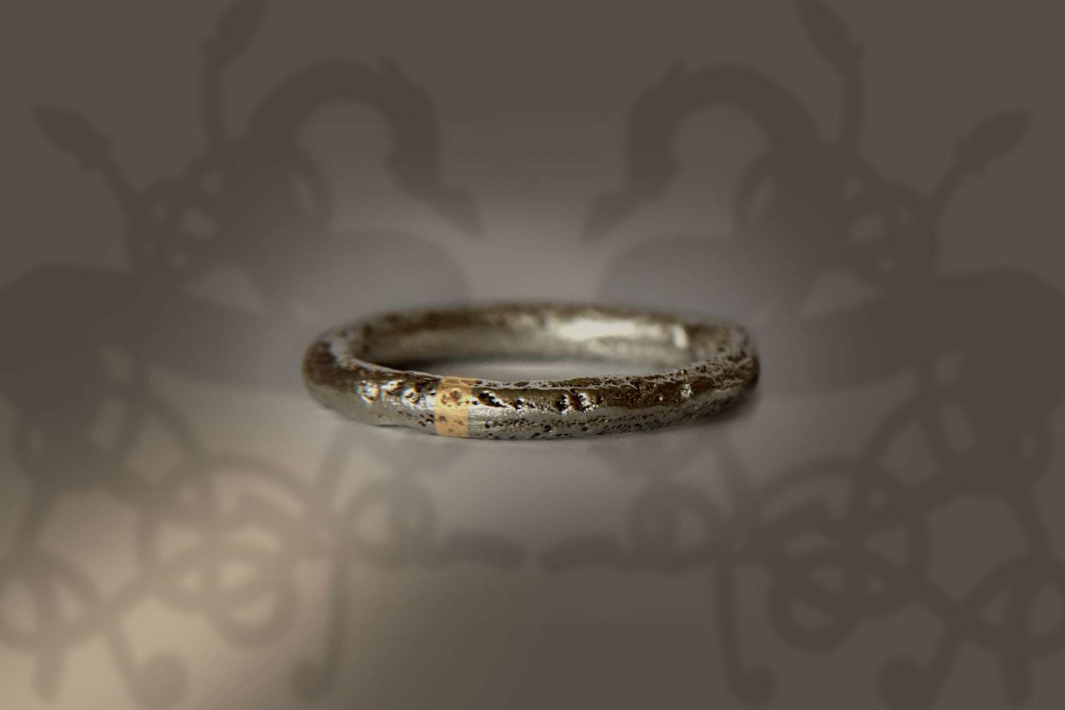 The ring’s dark patina adds depth and character, enhancing its ancient, weathered appearance. At the front, a 24ct gold detail gleams, providing a striking contrast to the dark and textured silver band. This unique combination of materials not only accentuates the ring’s visual appeal but also symbolizes the fusion of strength and beauty, much like the union it represents.